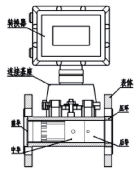 溫壓補償型氣體渦輪流量計的基本結構如圖所示,它主要由表體、機芯(前導向、中導向、后導向)、連接基座和轉換器等組成。