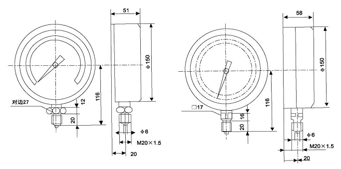 ○為適應不同的使用環境,精密壓力表在材質上有普通型與不銹鋼材質;功能上有YBN-150A與YBN-150B型耐震型精密壓力表(不銹鋼材質)。