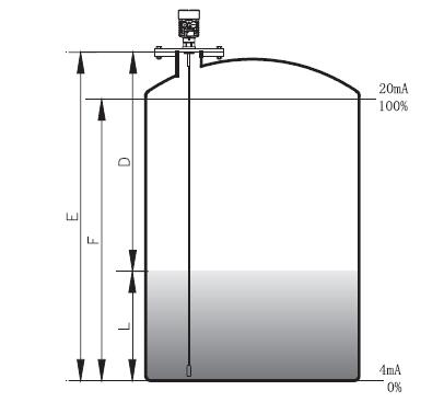 通過輸入空罐高度E(=零點),滿罐高度F(=滿量程)及一些應(yīng)用參數(shù)來設(shè)定,應(yīng)用參數(shù)將自動使儀表適應(yīng)測量環(huán)境。對應(yīng)于4~20mA輸出。